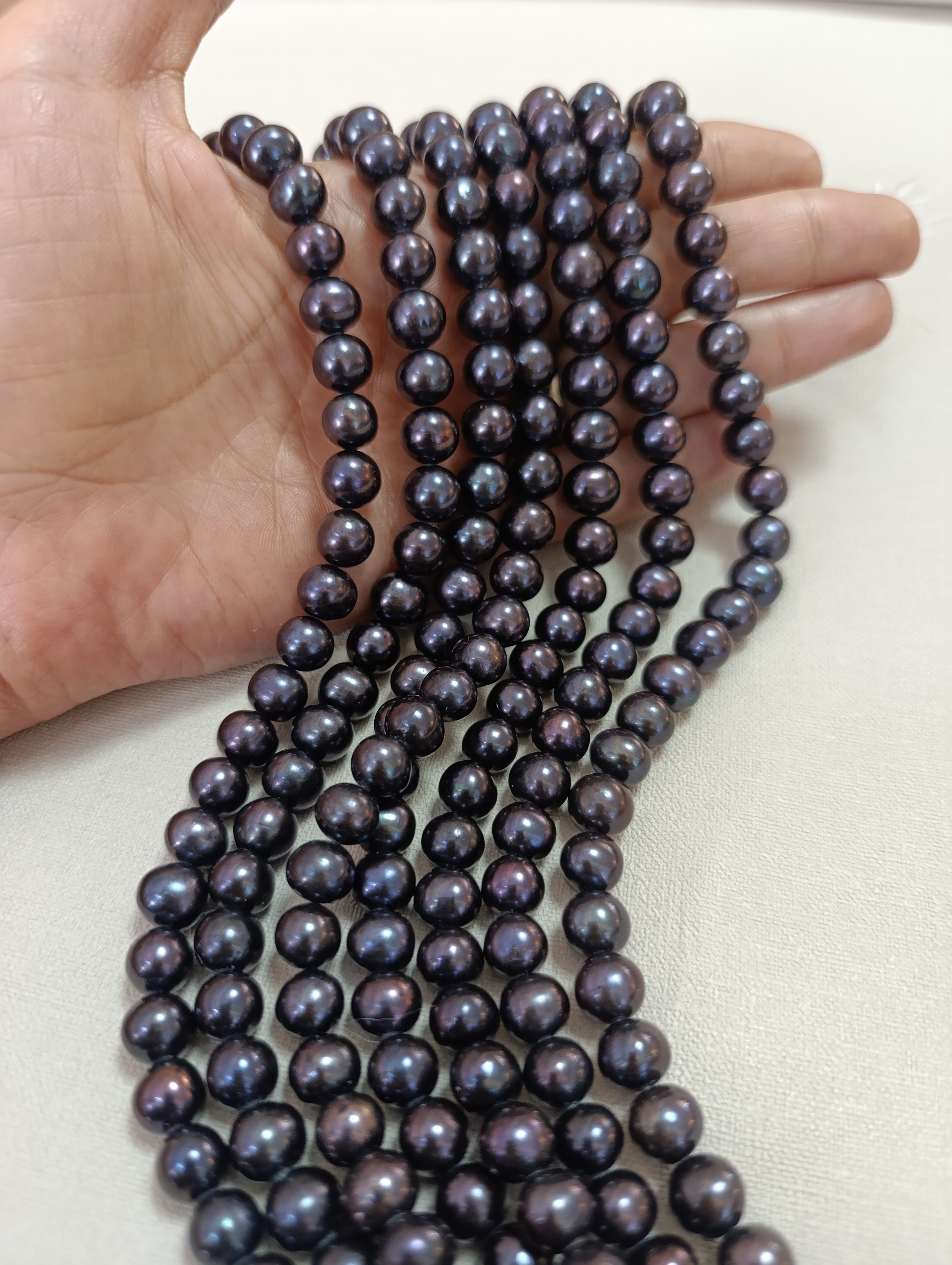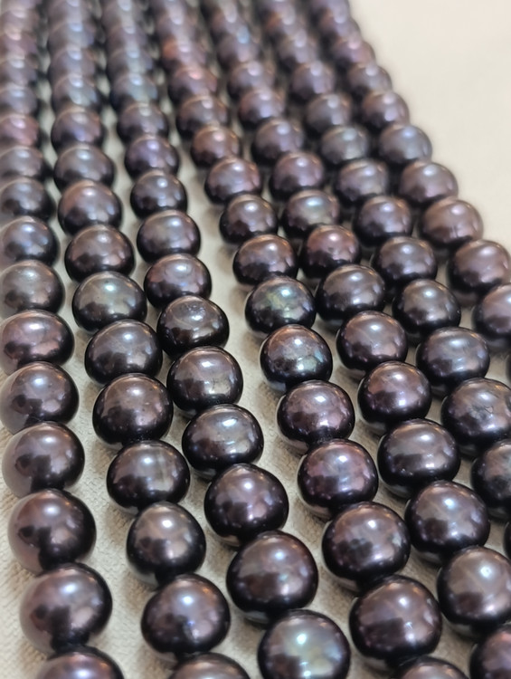 رشتهای از مرواریدهای طبیعی آب شیرین با رنگ نادر و خیرهکننده تاهیتی، مناسب برای طراحی و تولید زیورآلات خاص و فاخر. این مرواریدها با قطر تقریبی ۹ میلیمتر، سطحی براق، با کیفیت بالا و با درخشش طبیعی ارائه میشوند. رنگ تاهیتی با بازتابهای بنفش، سبز و آبی، جلوهای منحصربهفرد و چشمنواز به این مرواریدها بخشیده است.