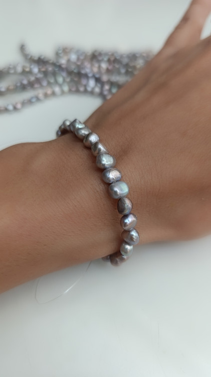 این رشته مروارید باروک طبیعی با رنگ خاص یاسی-خاکستری، انتخابی ایدهآل برای ساخت زیور آلات دستساز است. هر دانه مروارید با فرم نامنظم و درخشش منحصربهفرد خود، زیبایی طبیعی و لوکس را به هر اثری اضافه میکند.
