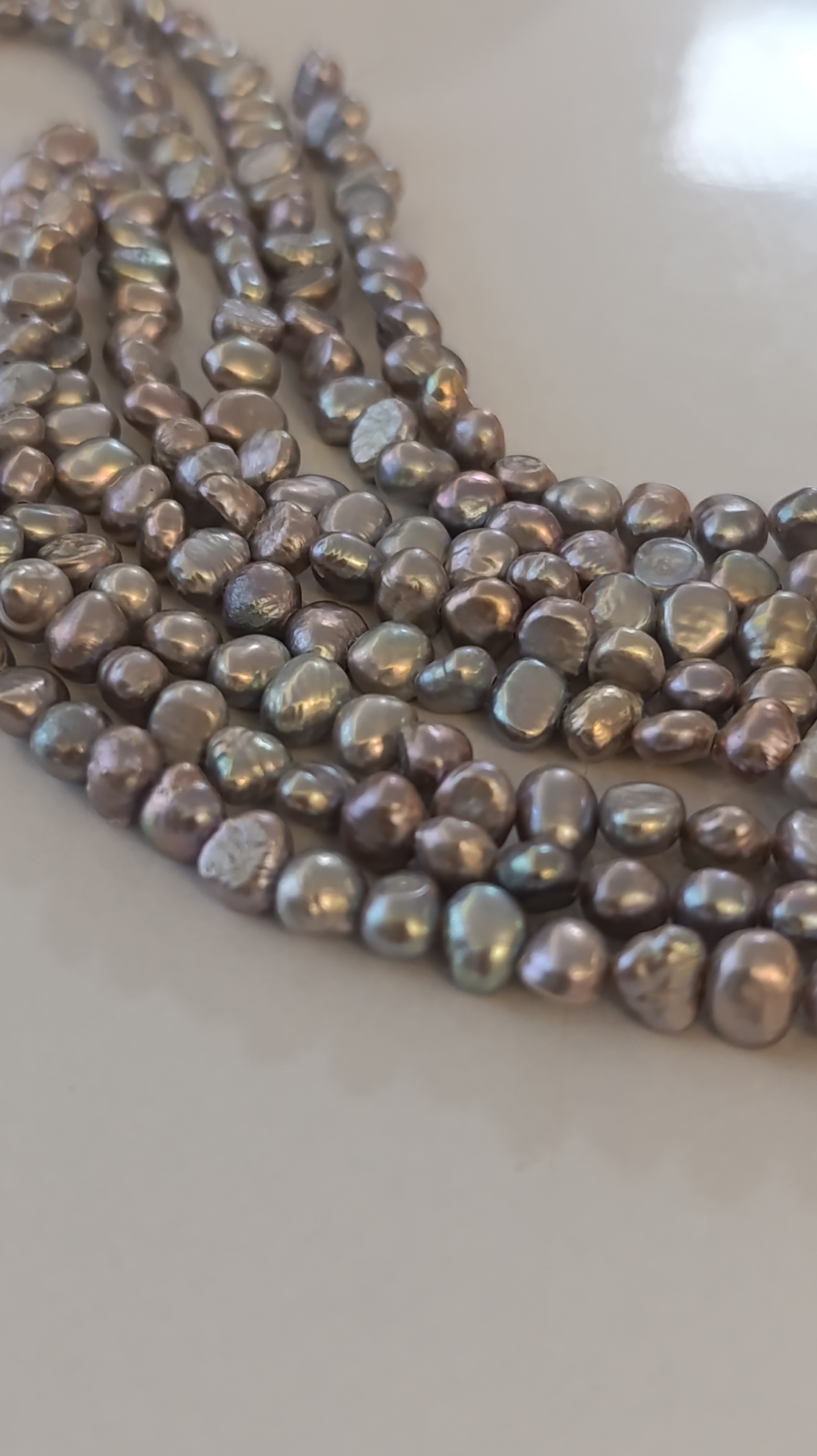 این رشته مروارید باروک طبیعی با رنگ خاص یاسی-خاکستری، انتخابی ایدهآل برای ساخت زیور آلات دستساز است. هر دانه مروارید با فرم نامنظم و درخشش منحصربهفرد خود، زیبایی طبیعی و لوکس را به هر اثری اضافه میکند.